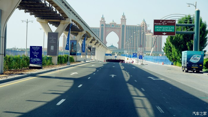 乘坐无人轻轨离开棕榈岛时拍的亚特兰蒂斯酒店全景。