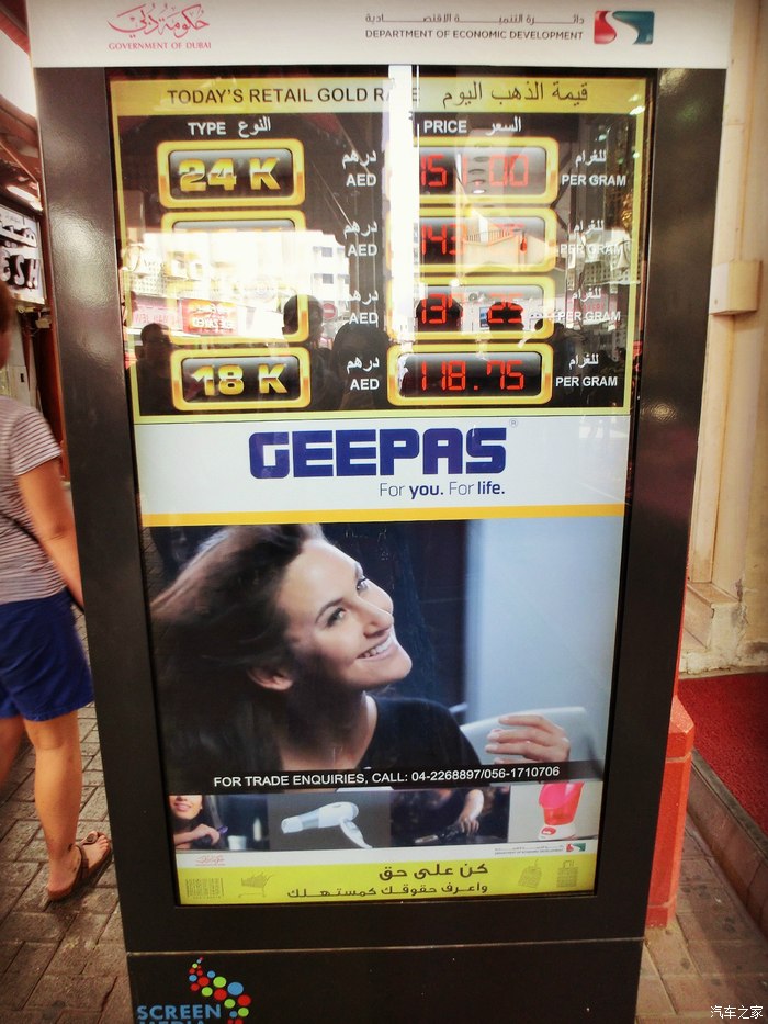 当日金价,AED是当地货币迪拉姆的意思,汇率大概是1:1.67,所以当天金价18k的是198.31元,22k是229.2元,24k是252.17元,大家可以参考一下。