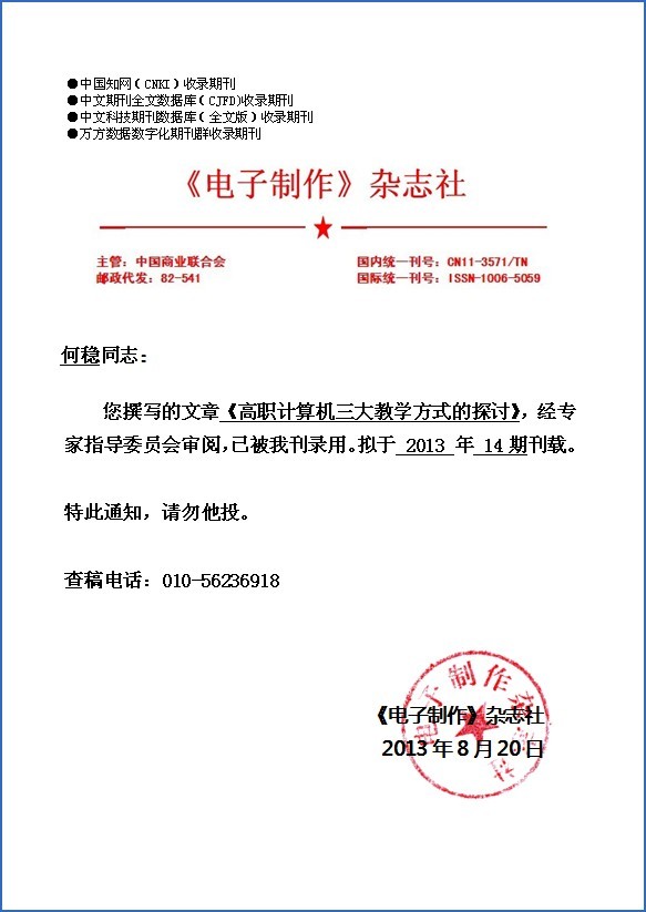 《高职计算机三大教学方式的探讨》录用通知书