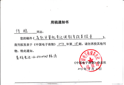 上一篇:《高职计算机三大教学方式的探讨》录用通知书