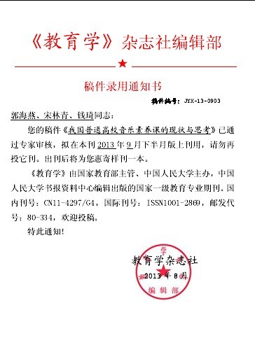 《我国普通高校音乐素养课的现状与思考》录用
